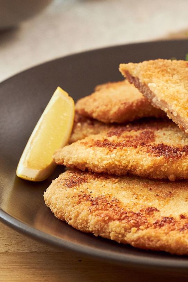 twee gepaneerde varkensschnitzels | peperroomsaus