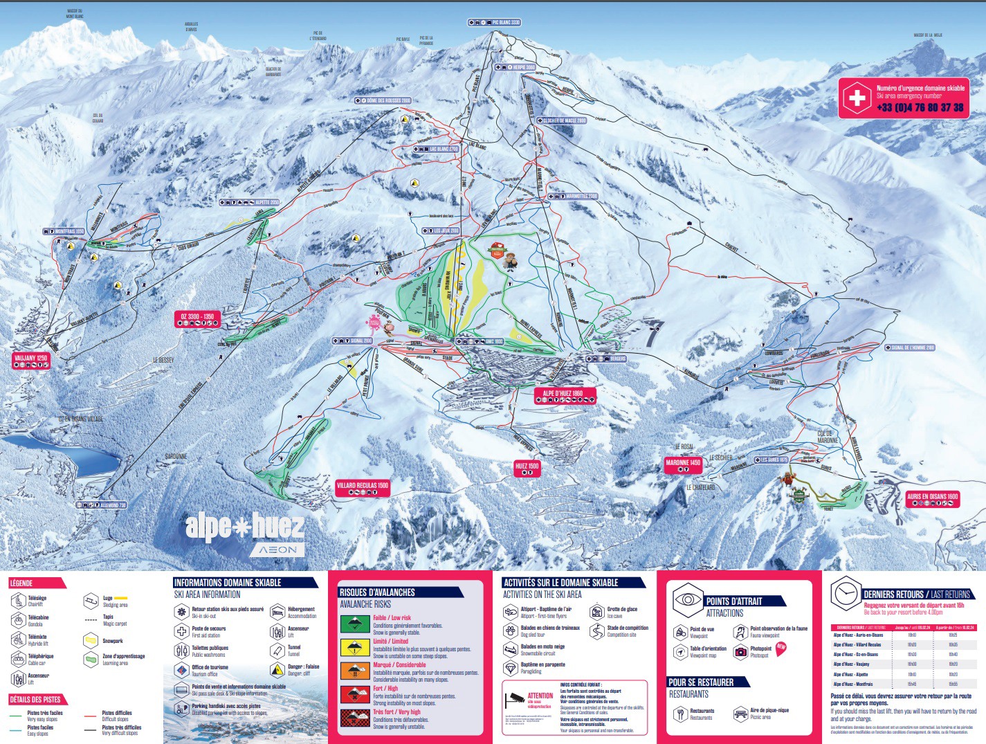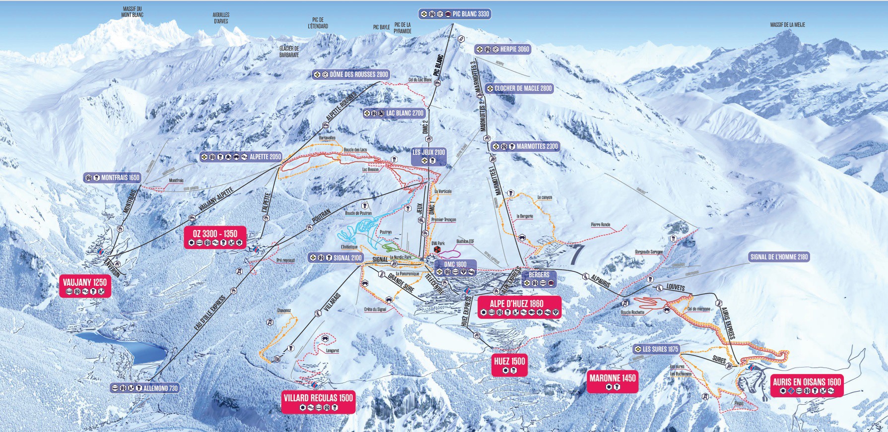 Het dorp Alpe d'Huez vormt samen met de omliggende dorpen Huez, Vaujany, Oz-en-Oisans en Auris-en-Oisans het skigebied "Grand Domaine Ski Alpe d’Huez"(piste kaart). Sinds een paar jaar is het dorp Allemond ook aangesloten op het skigebied omdat er een gondellift is die Allemond met Oz-en-Oisans verbindt. Deze lift, de Eau d'Olle Express, ligt op 6 minuten rijden van ons vakantiepark.